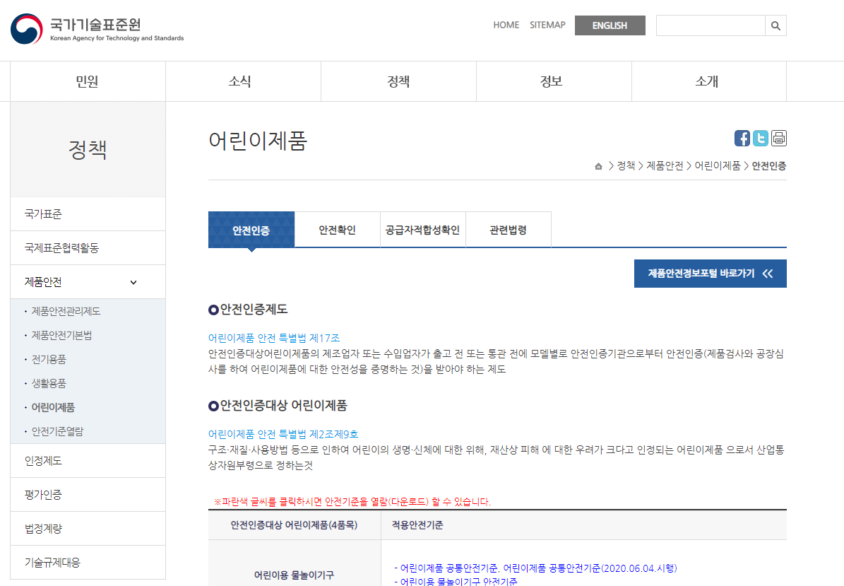 한국기술표준원에서 확인하실수 있는 품목중 어린이제품 관련 내용 입니다.