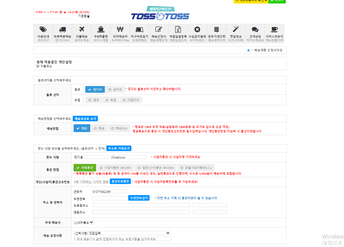 배송대행신청을 누르면 중국의 지점을 정할수 있고, 기본적인 정보를 입력할수 있게 뜹니다.