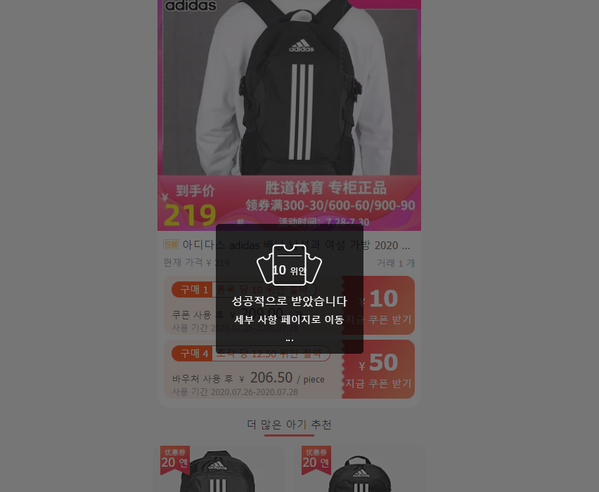 아래의 제품은 219위안에서 209위안 1800원을 더 저렴하게 살수있는 쿠폰이 발행가능하네요!!
