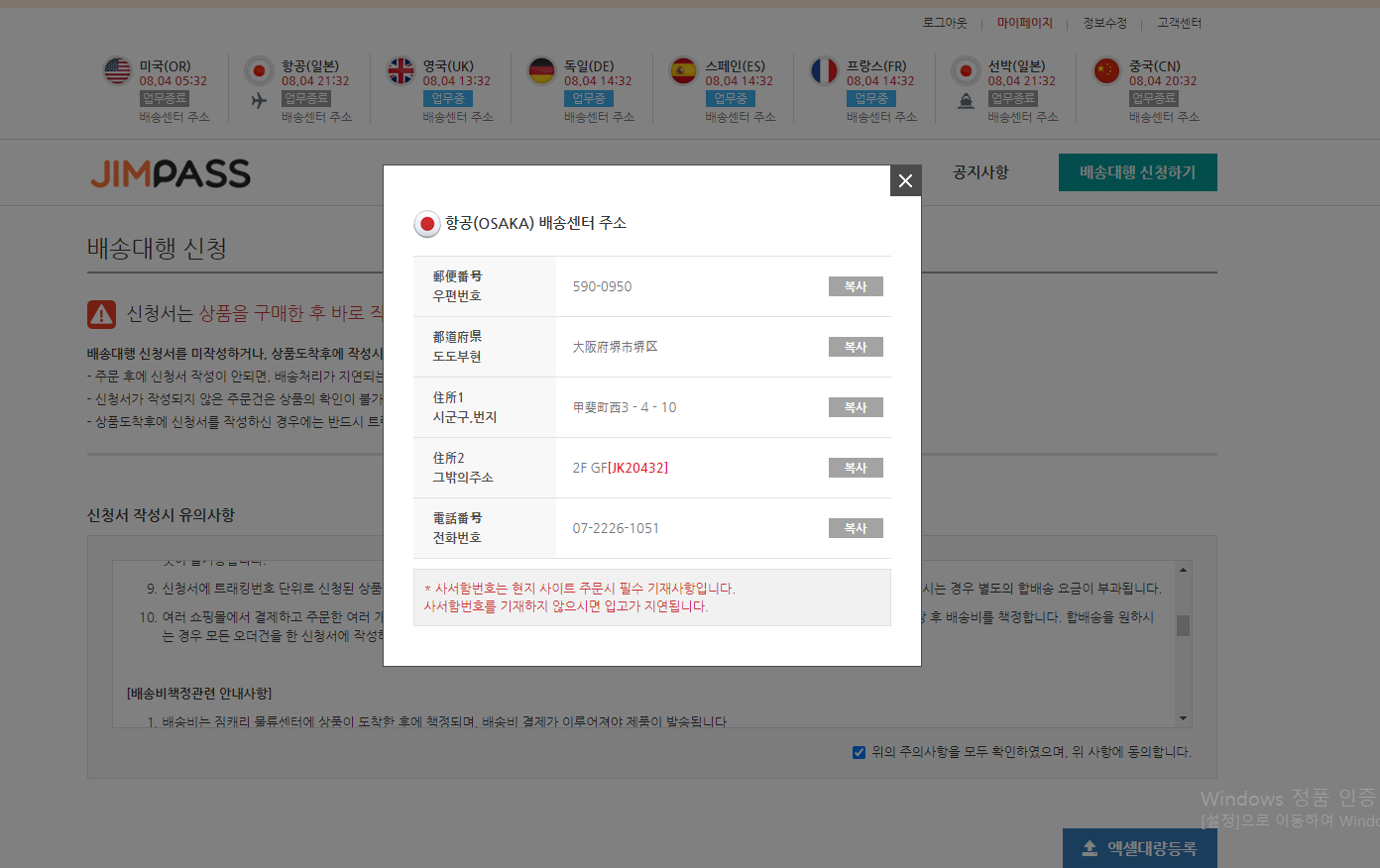 작성해주시면되요. 저는 JIMPASS 라는 일본 배송대행지를 사용하고 있습니다.